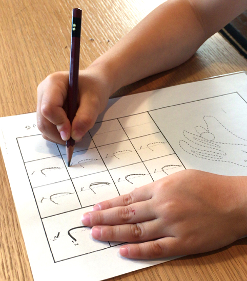 お母さまと一緒にお稽古を楽しんでくれている、小学生のAちゃんと幼稚園のHちゃん姉妹。レッスン中は二人とも、鉛筆を正しく持って一生懸命に学習に励んでくれています。美しい字を書くための必須条件は…